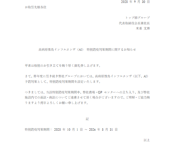 カテゴリー カテゴリー を選択 お知らせ 新着情報 アーカイブ 月を選択 2025年9月 2025年7月 2025年4月 2025年3月 2025年2月 2024年10月 2024年5月 2024年2月 2023年10月 2023年7月 2023年3月 2022年12月 2022年10月 2022年4月 新着情報 高病原性鳥インフルエンザ(AI)特別防疫対策期間 に関するお知らせ 2025.09.30 新着情報 トップ卵グループ60周年記念のご挨拶 2025.09.21 新着情報 『たまニコチャレンジ』に参加します! 2025.09.01 お知らせ ヤマエグループ総合展示商談会に参加いたしました 2025.07.25 お知らせ 新着情報 2025年春の入社式を実施いたしました 2025.04.15 新着情報 菜の花ウォークへの協賛について 2025.03.14 新着情報 飼料流通合理化の取組に関するお知らせ 2025.03.13 お知らせ 本社自動ドアのデザインがリニューアルされました 2025.02.19 新着情報 ヤマエグループ総合展示商談会に参加いたしました 2025.02.06 新着情報 国連WFP協会より感謝状をいただきました 2024.10.22 お知らせ 高病原性鳥インフルエンザ(AI)特別防疫対策期間 に関するお知らせ 2024.10.01 お知らせ 代表取締役の異動(社長交代)に関するお知らせ 2024.10.01 1 2 » グループ情報 Group Information 代表挨拶 トップ卵グループ概要 サステナビリティ 沿 革 品質管理 採用情報 個人情報保護方針 お問い合わせ